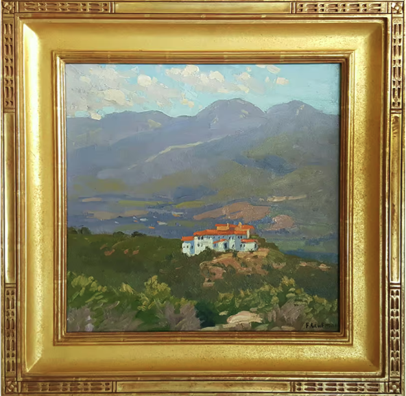 This painting depicts the former Flintridge Biltmore Hotel (1926–1931], now the Sacred Heart Academy in La Canada, CA.